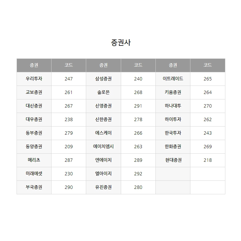 은행기관과 증권사 코드를 확인하여 해당 사이트에서 갱신이 가능합니다.