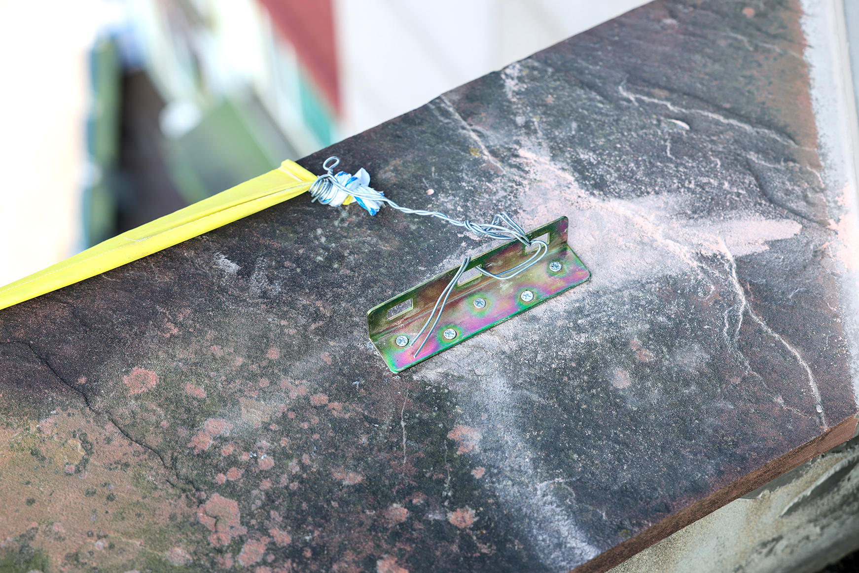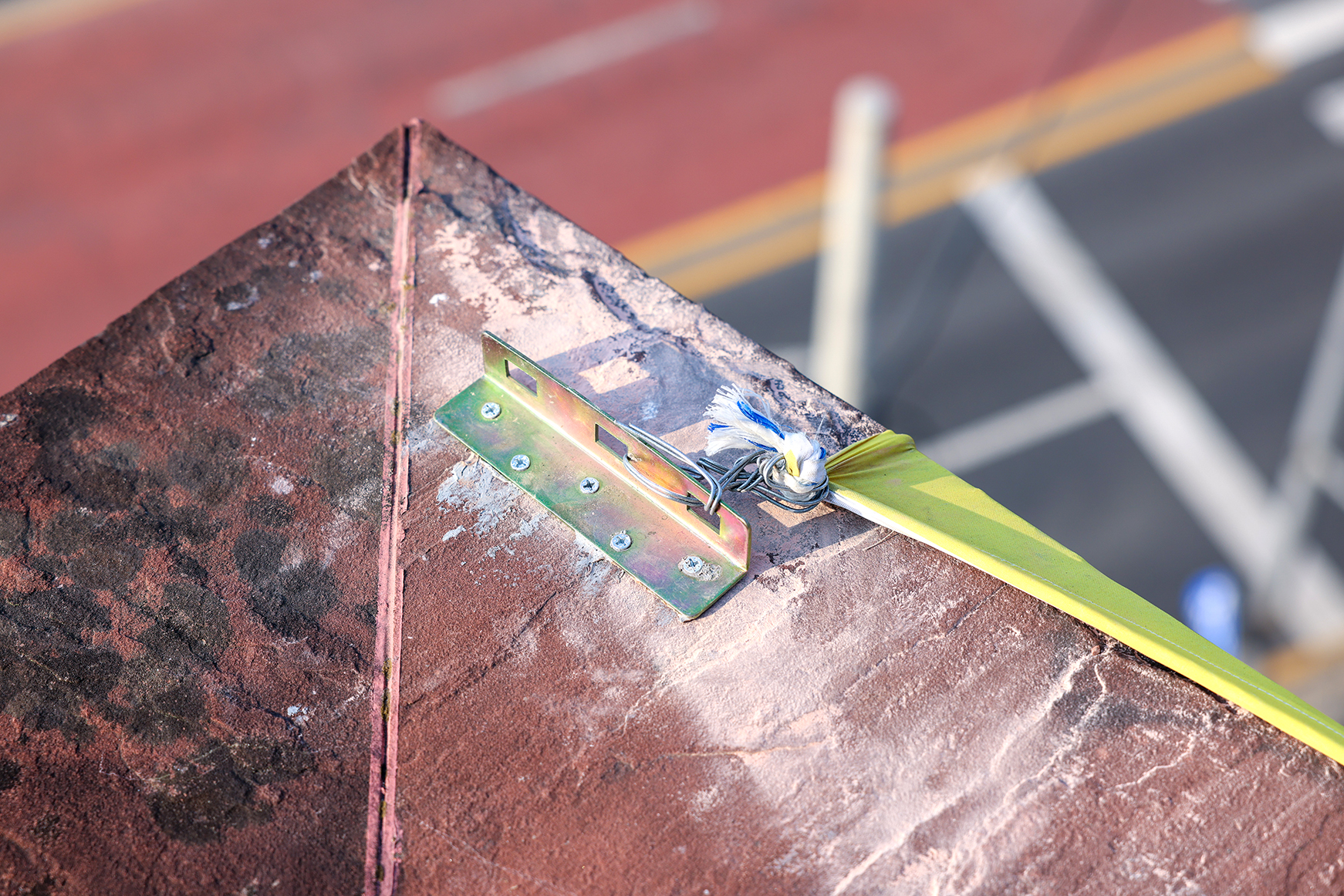 ✅ 현장에 현수막을 거치할 수 있는 고리가 있는지 확인해요. 만약 고리가 없다면 고정장치 작업은 필수입니다. 옥상에 3개의 고정대와 아래에 고정대 3개를 작업해줍니다.