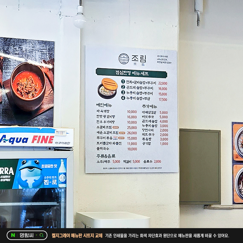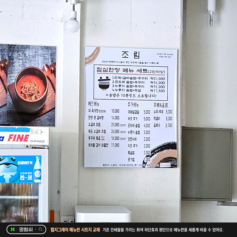 켈지 그레이 출력은 합리적인 비용과 짧은 시공 시간으로 메뉴판을 새것처럼 바꿀 수 있는 좋은 방법이에요.
