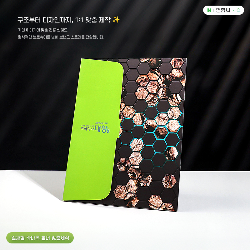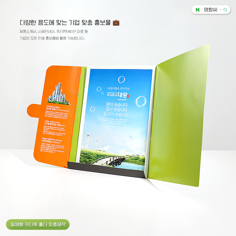 기업 브로슈어와 카달로그를 한 번에 담을 수 있는 맞춤형 종이 폴더형 카달로그 제품이에요.