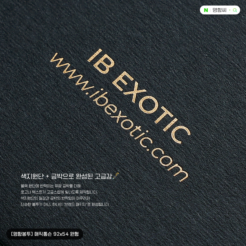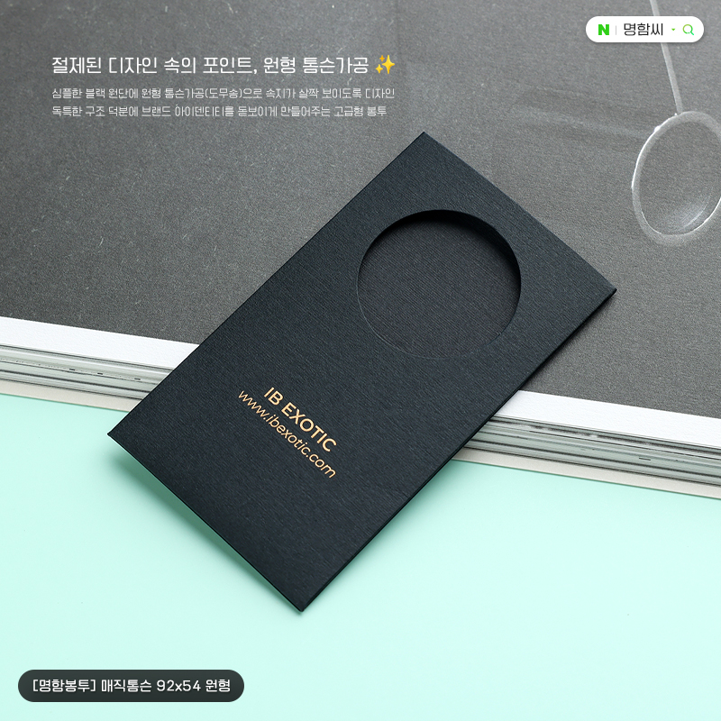 색지원단 기반 맞춤형 명함봉투(92x54, 원형). 23종 용지와 금·은·컬러박·형압 등 후가공 선택, 200매부터 주문. 제작 7~10일(조립 포함), 속지 별도