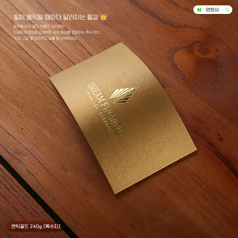 골드빛 갈색 펄감이 모던한 엔틱골드 240g 펄지 명함. 200매·90×50mm, 시안확정 후 3~5영업일 제작. 금/은박·라운딩·형압·엠보싱 등 후가공 가능