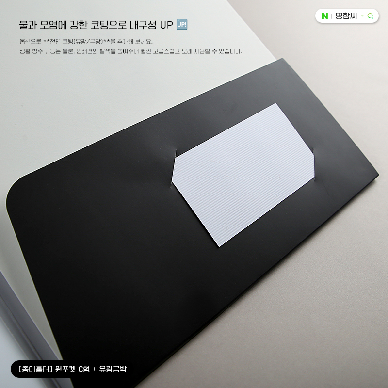 홀더를 펼치는 순간, 고객의 시선이 머무는 곳에 명함 꽂이(슬롯)가 위치합니다.