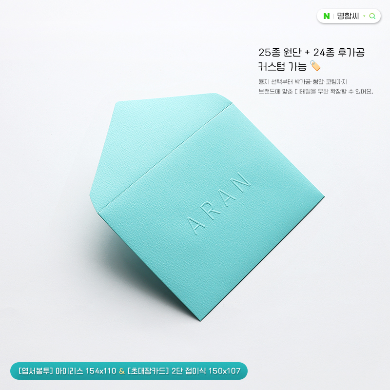 카드 겉면에는 은은하게 빛나는 무광 은박을 적용해 파스텔 옥색과 어우러지는 세련된 첫인상을 완성했습니다.