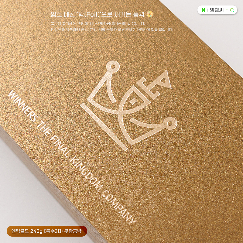 이미지 속 금빛 글자들도 잉크가 아닌 박가공(금박)으로 제작된 것이며, 꼭! 후가공을 선택하셔야 합니다.