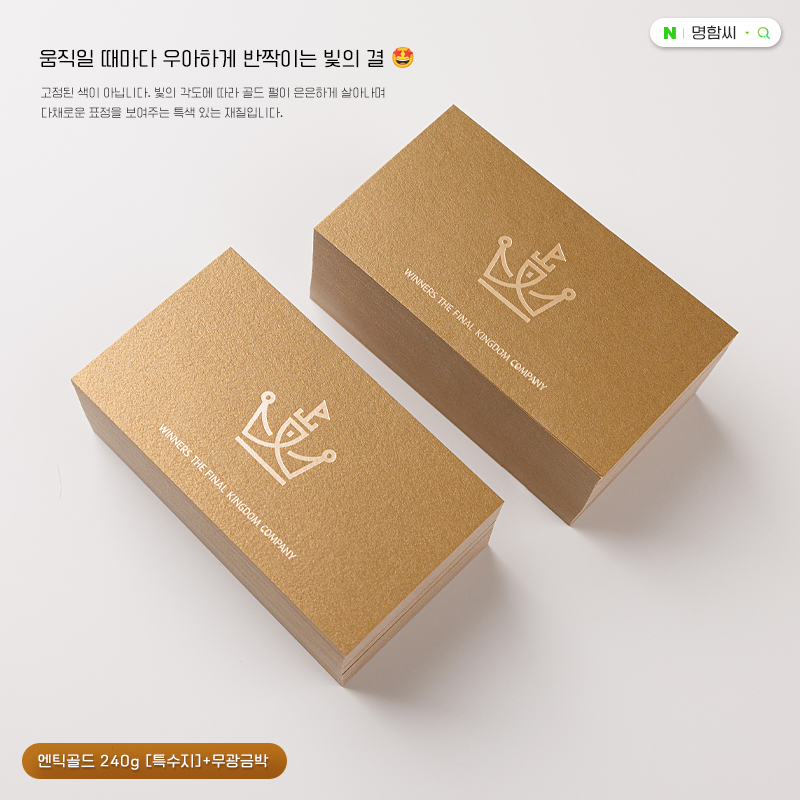골드빛 갈색 펄감이 모던한 엔틱골드 240g 펄지 명함. 200매·90×50mm, 시안확정 후 3~5영업일 제작. 금/은박·라운딩·형압·엠보싱 등 후가공 가능