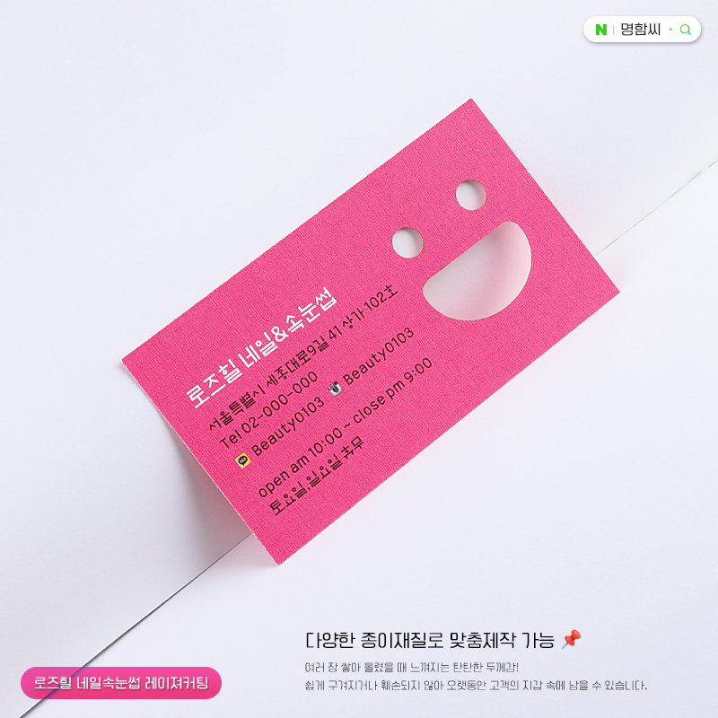 레이저 정밀 커팅으로 예술성을 더한 로즈힐 네일·속눈썹 명함입니다. 뷰티 샵의 섬세한 감각을 담아 로고나 문양을 입체적으로 투영하며, 고객에게 잊지 못할 첫인상과 전문적인 브랜드 가치