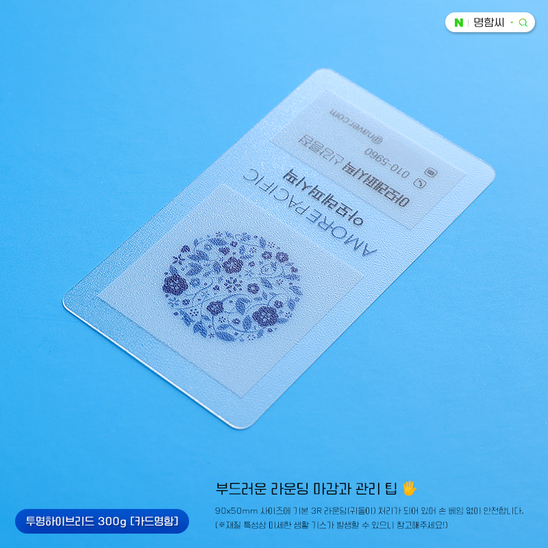 투명·반투명·화이트/컬러 단면 인쇄가 가능한 투명하이브리드 300g 카드명함. 부분 UV 인쇄로 포인트 연출, 90×50mm·기본 3R 라운딩, 플라스틱 특성상 표면 기스 유의. 시안확정 후 주 1회 조판으로