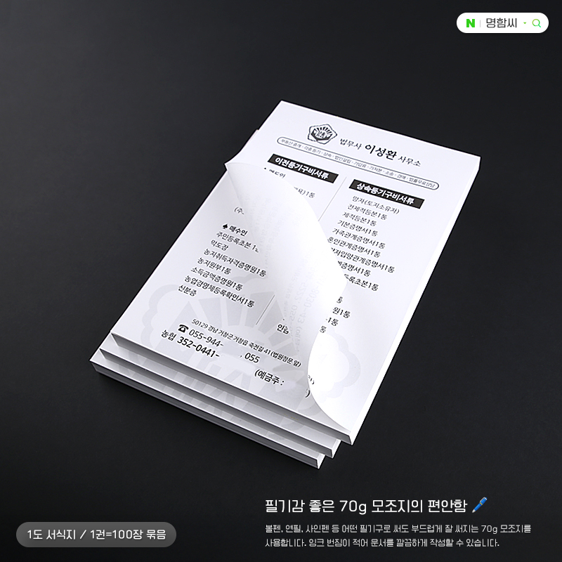 명함씨는 볼펜, 연필, 사인펜 등 어떤 필기구를 써도 부드럽게 써지는 70g 모조지를 사용합니다.