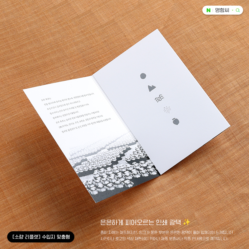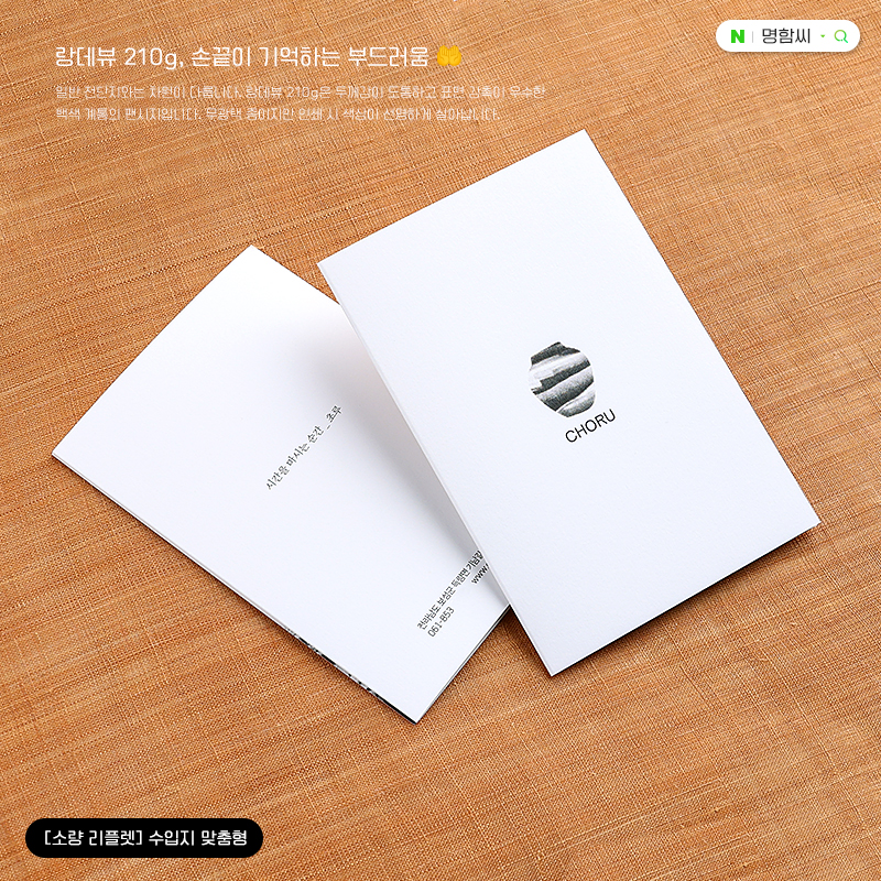 필요한 만큼만 알뜰하게! 고급 수입지 랑데뷰 210g으로 제작하는 소량 맞춤 리플렛입니다. 도톰한 두께감과 부드러운 인쇄감이 특징이며, 터짐 방지 오시(누름선) 가공을 더해 완성도를 높였습니