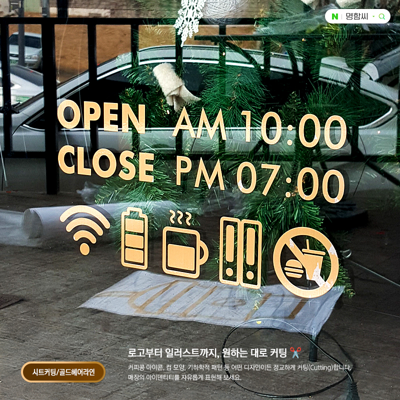 매장 유리에 딱! 원하는 문구와 로고를 깔끔하게. 시트커팅, 레터링 스티커, 유리창 썬팅 문구 제작 전문. 보조테이프와 헤라 무료 증정으로 셀프 시공도 간편하게 명함씨에서 주문하세요.