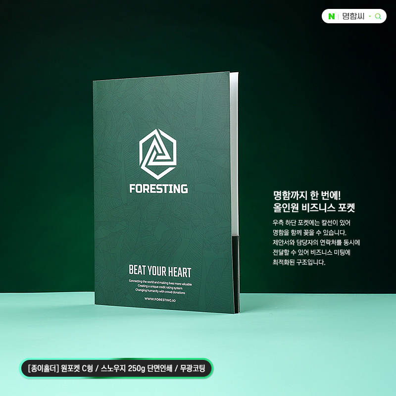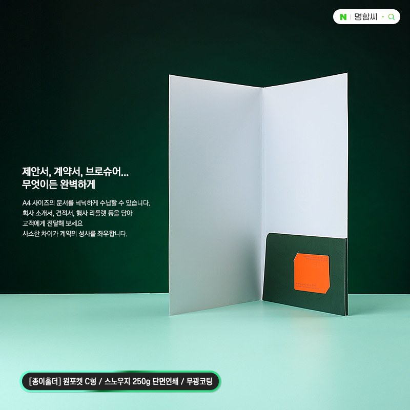 세련된 사선 컷팅 디자인! 서류 보관과 열람이 편리한 원포켓 C형 종이홀더. 도톰한 300g 용지에 맞춤 컬러 인쇄로 기업 제안서, 견적서, 브로슈어를 더욱 돋보이게 만드세요. 명함 꽂이 포함.