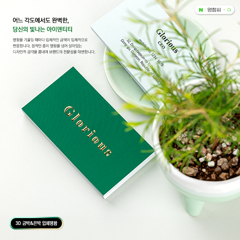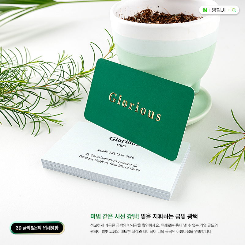 마법같은 시선 강탈, 손끝에서 느껴지는 입체감의 3D 금박 명함. 200매 기본, 규격 90×50mm(비규격 별도 상담). 샘플 촬영: 일반지 고품격고팅 300g에 3D 금박과 벨벳 코팅. 단면 또는 양면, 금박 또는